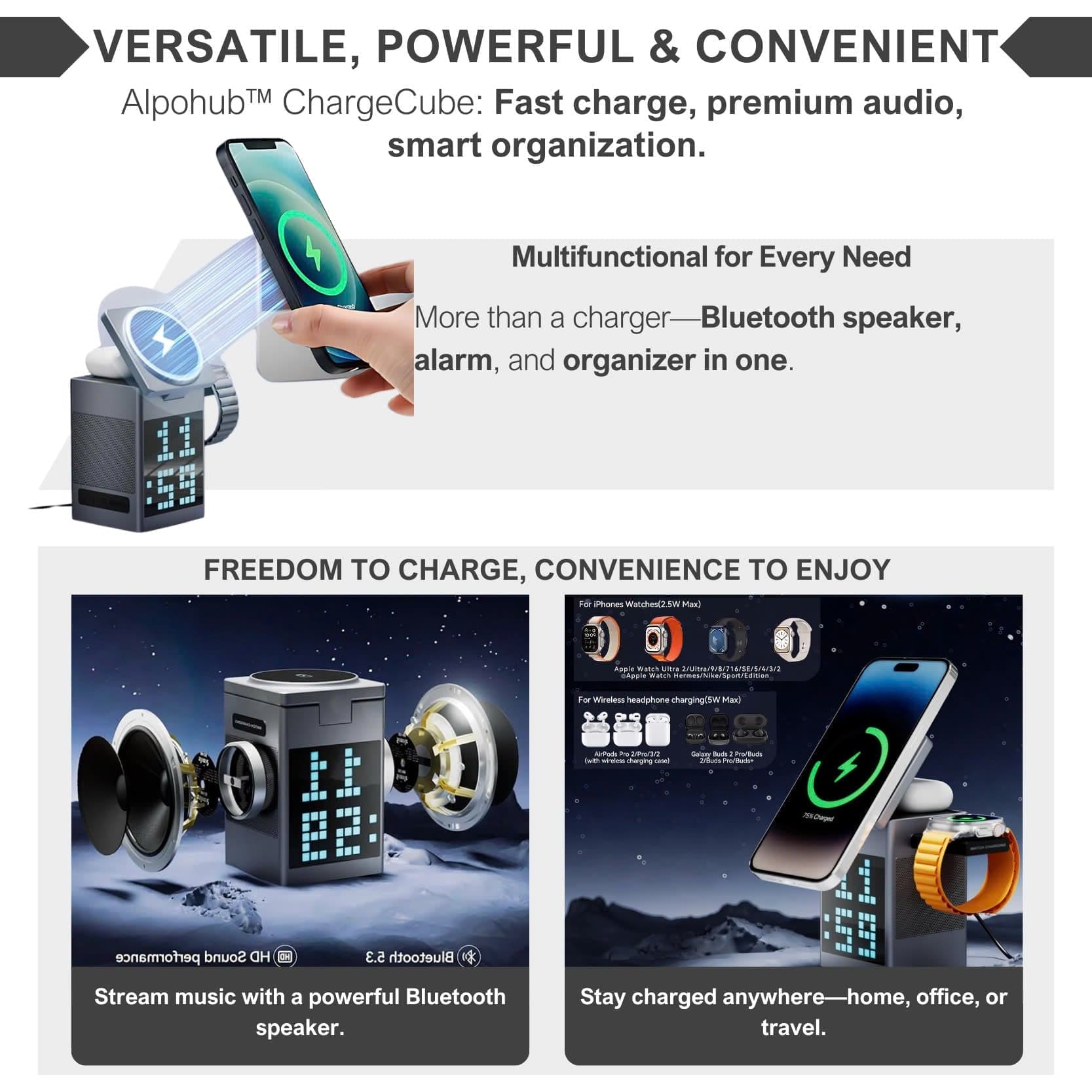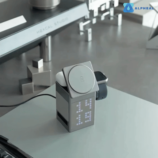After extensive research and development, Alpohub™ has created the 6-in-1 Magnetic Wireless Charger with Bluetooth Speaker & Alarm Clock, redefining convenience and functionality. Users report a seamless charging experience, a sturdy and compact design, and a significant improvement in workspace organization. The integrated Bluetooth speaker adds a unique touch for casual listening, while the customizable clock display enhances usability. These features underscore Alpohub™’s commitment to excellence, setting a new standard for multifunctional tech solutions.
