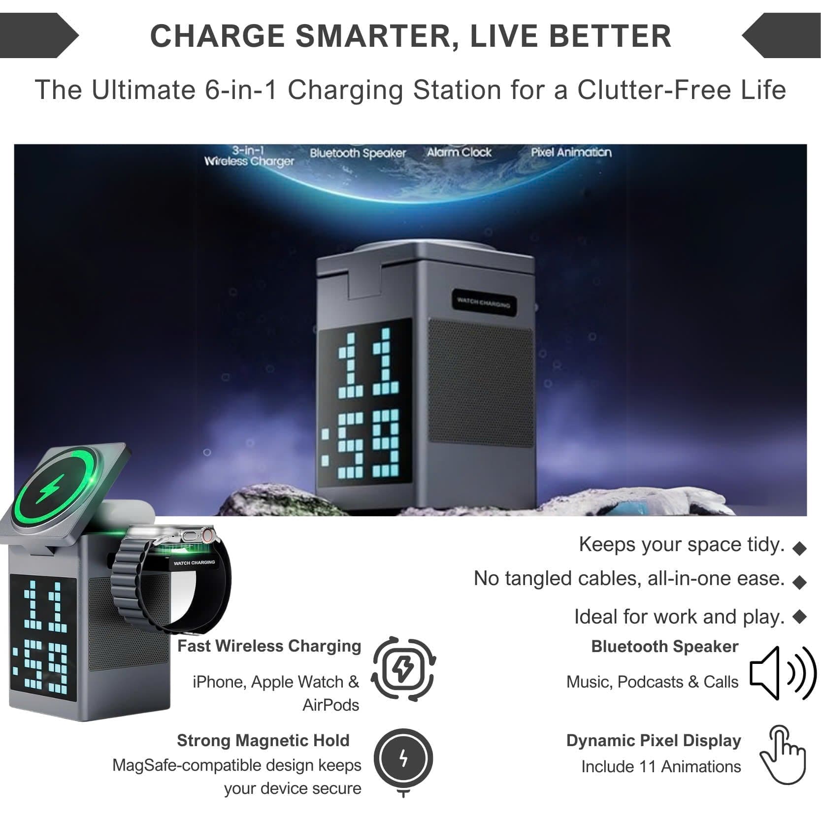 As modern life demands efficiency and convenience, having the ultimate multi-tool is essential. Enter the Alpohub™ 6-in-1 Magnetic Wireless Charger with Bluetooth Speaker & Alarm Clock, offering: