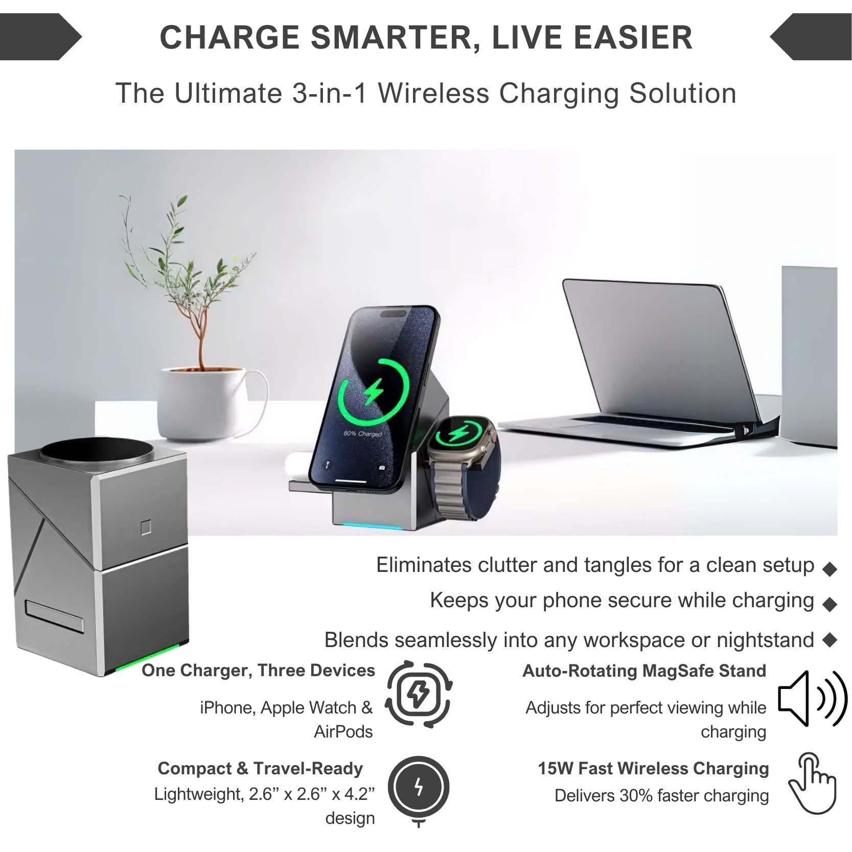 Enhance every aspect of your daily routine with the Alpohub™ CubeCharge 3-in-1 Wireless Charging Station. From eliminating cord clutter to adding a touch of modern sophistication, this is more than just a charger – it’s a solution for seamless, efficient living. Embrace the power of fast, multi-device charging with style.